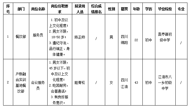 根據(jù)綿陽市綿州嘉來會務(wù)服務(wù)有限公司發(fā)布的招聘公告及招聘相關(guān)規(guī)定,經(jīng)面試、體檢等程序,擬錄用陳正帥、眭青松同志到餐飲部、產(chǎn)教融合實訓(xùn)基地餐飲部工作,現(xiàn)予以公示,具體情況如下: