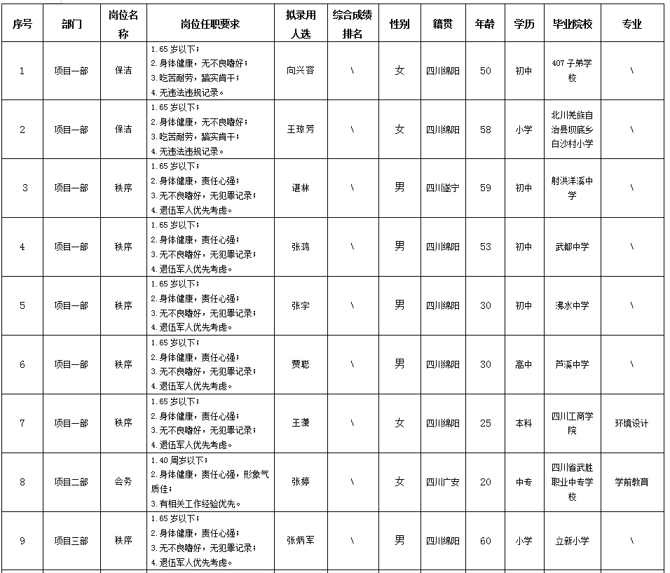 根據(jù)綿陽市康來物業(yè)服務(wù)有限公司發(fā)布的招聘公告及招聘相關(guān)規(guī)定,經(jīng)面試等程序,擬錄用向興容等同志到各項目部工作,現(xiàn)予以公示,具體情況如下: