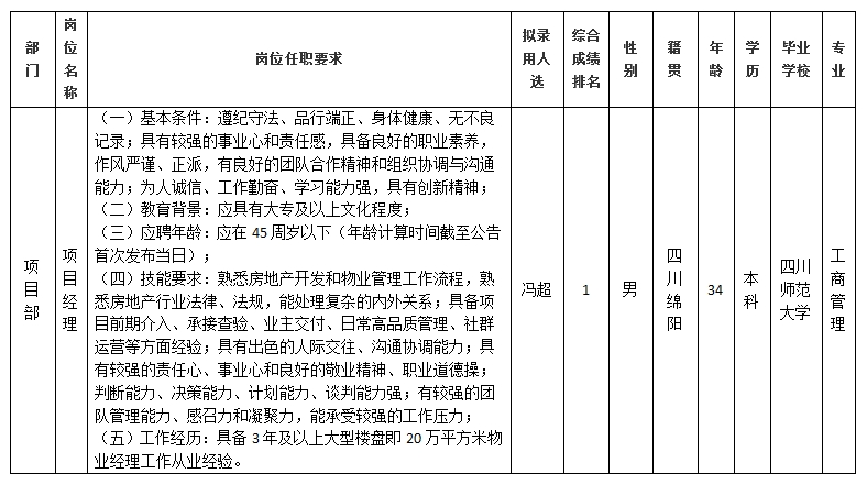 根據(jù)綿陽市康來物業(yè)服務有限公司發(fā)布的招聘公告及招聘相關規(guī)定,經(jīng)筆試、面試、背景調(diào)查等程序,擬錄用馮超同志到綿陽市康來物業(yè)服務有限公司項目部工作,現(xiàn)予以公示,具體情況如下: