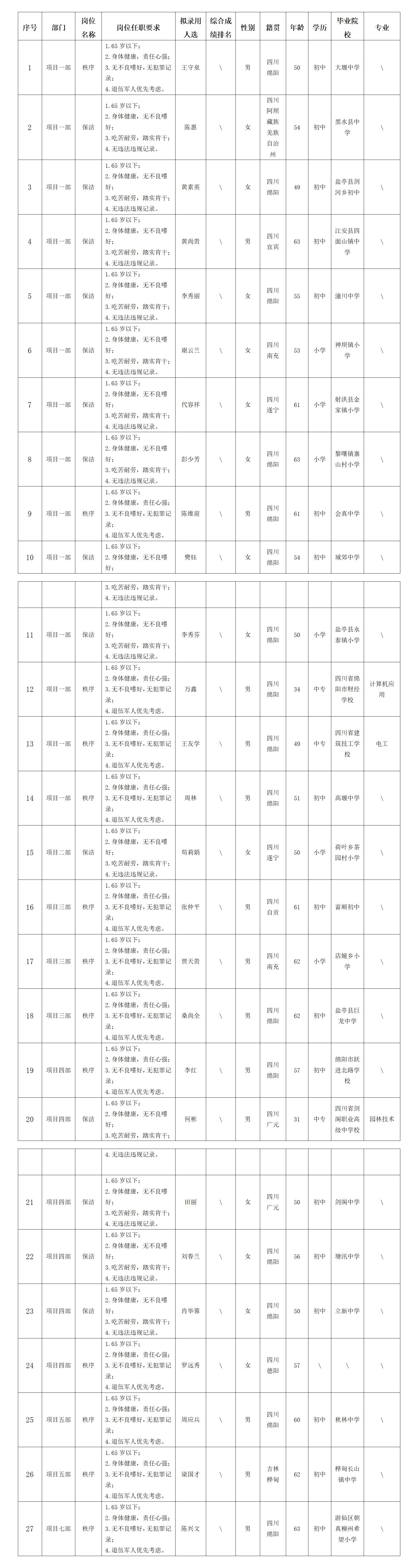 根據(jù)綿陽市康來物業(yè)服務(wù)有限公司發(fā)布的招聘公告及招聘相關(guān)規(guī)定,經(jīng)面試等程序,擬錄用王守泉等同志到各項目部工作,現(xiàn)予以公示,具體情況如下: