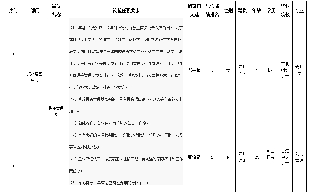 根據(jù)綿陽(yáng)市投資控股(集團(tuán))有限公司發(fā)布的招聘公告及招聘相關(guān)規(guī)定,經(jīng)筆試、面試、考察、體檢等程序,擬錄用彭書敏等同志到綿陽(yáng)市投資控股(集團(tuán))有限公司工作,現(xiàn)予以公示,具體情況如下:
