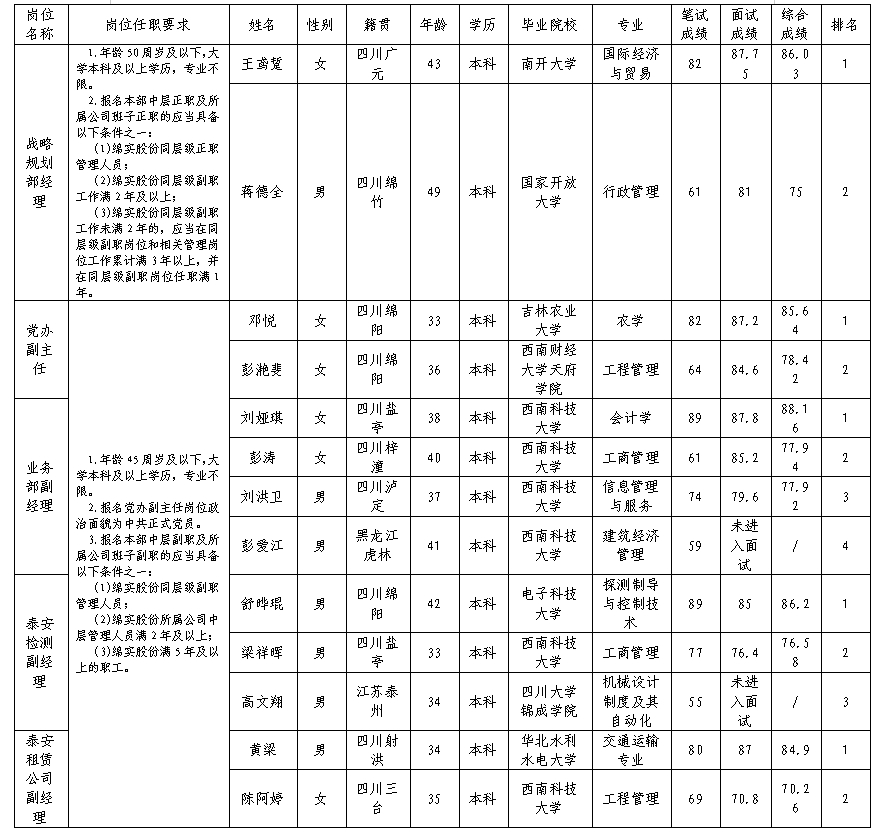 根據(jù)綿陽(yáng)市汽車(chē)實(shí)驗(yàn)駕駛技術(shù)學(xué)校股份有限公司發(fā)布的內(nèi)部競(jìng)聘公告及內(nèi)部競(jìng)聘相關(guān)規(guī)定,經(jīng)筆試、面試等程序,現(xiàn)將內(nèi)部競(jìng)聘成績(jī)予以公示。