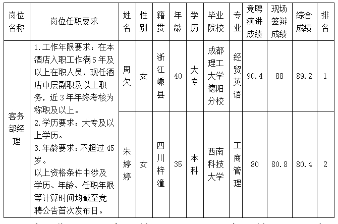 根據(jù)綿陽(yáng)富樂(lè)山九洲國(guó)際酒店有限公司關(guān)于客務(wù)部經(jīng)理內(nèi)部競(jìng)聘公告及招聘相關(guān)規(guī)定,經(jīng)競(jìng)聘演講、現(xiàn)場(chǎng)答辯等程序,現(xiàn)將競(jìng)聘成績(jī)予以公示。