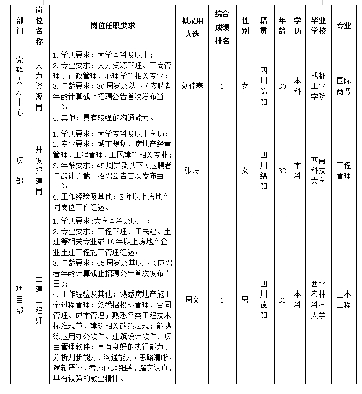 根據(jù)綿陽市綿投置地有限公司發(fā)布的招聘公告及招聘相關(guān)規(guī)定,經(jīng)筆試、面試、考察、體檢等程序,擬錄用劉佳鑫等3名同志到綿陽市綿投置地有限公司工作,現(xiàn)予以公示,具體情況如下:
