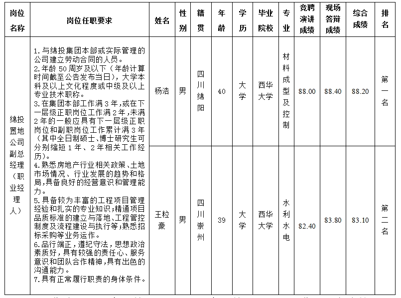 根據(jù)綿投集團《關于開展綿投置地公司經(jīng)理層副職(職業(yè)經(jīng)理人)內(nèi)部選聘的公告》(綿投控司發(fā)〔2025〕119號)及招聘相關規(guī)定,經(jīng)競聘演講、現(xiàn)場答辯等程序,現(xiàn)將競聘成績予以公示。