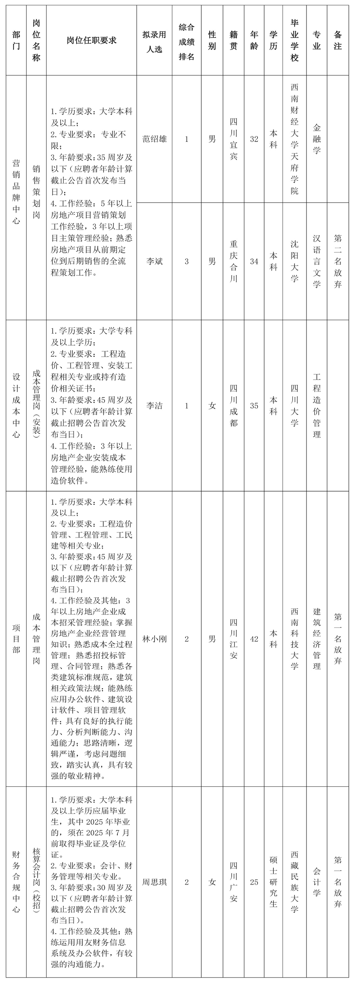 根據(jù)綿陽(yáng)市綿投置地有限公司發(fā)布的招聘公告及招聘相關(guān)規(guī)定,經(jīng)筆試、面試、考察、體檢等程序,擬錄用范紹雄等5名同志到綿陽(yáng)市綿投置地有限公司工作,現(xiàn)予以公示,具體情況如下: