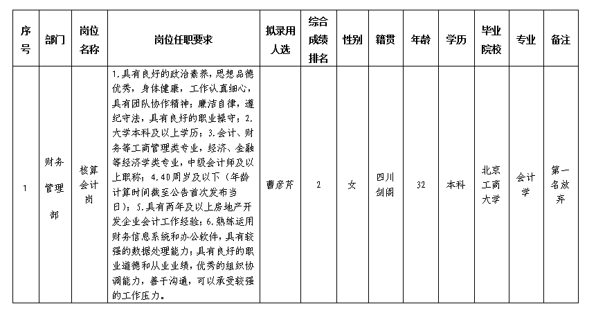 根據(jù)綿陽市嘉遠(yuǎn)瑞華房地產(chǎn)開發(fā)有限公司發(fā)布的招聘公告及招聘相關(guān)規(guī)定,經(jīng)筆試、面試、考察、體檢等程序,擬錄用曹彥芹同志到核算會計崗工作,現(xiàn)予以公示,具體情況如下: