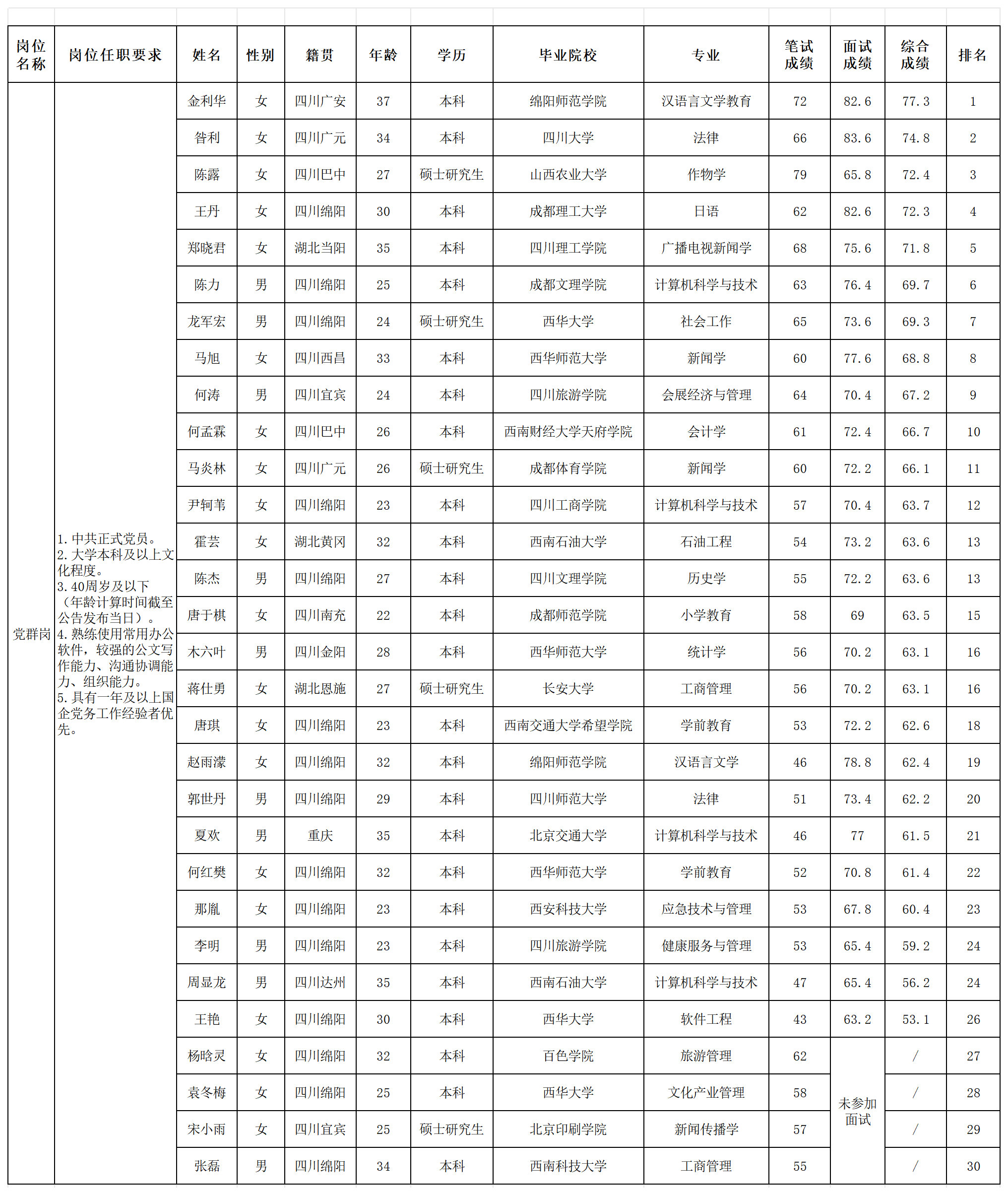 根據(jù)四川越王樓文化傳播有限公司發(fā)布的招聘公告及招聘相關(guān)規(guī)定,經(jīng)筆試、面試等程序,現(xiàn)將筆試(面試)成績予以公示。