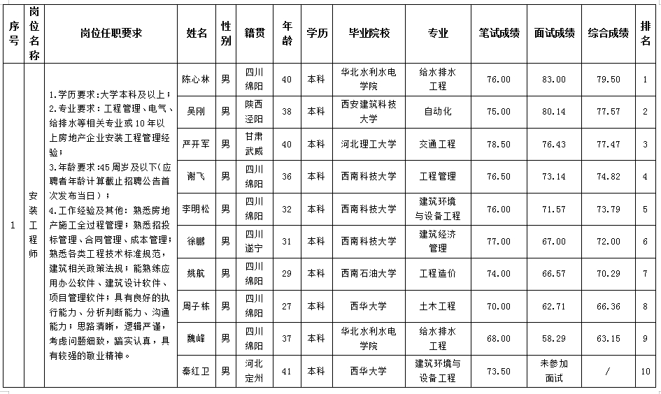 根據(jù)綿陽市綿投置地有限公司發(fā)布的招聘公告及招聘相關(guān)規(guī)定,經(jīng)筆試、面試等程序,現(xiàn)將筆試、面試成績予以公示。