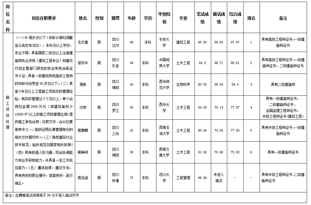 根據(jù)四川嘉來建筑工程有限公司發(fā)布的關(guān)于招聘施工項目經(jīng)理崗位的公告及招聘相關(guān)規(guī)定,經(jīng)筆試、面試等程序,現(xiàn)將筆試(面試)成績予以公示。