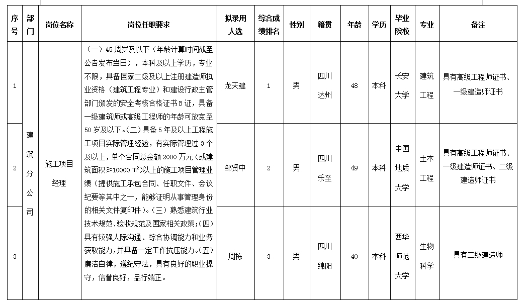 根據(jù)四川嘉來建筑工程有限公司發(fā)布的招聘公告及招聘相關(guān)規(guī)定,經(jīng)筆試、面試、考察、體檢等程序,擬錄用龍?zhí)旖ā⑧u賢中、周棟同志到四川嘉來建筑工程有限公司工作,現(xiàn)予以公示,具體情況如下:
