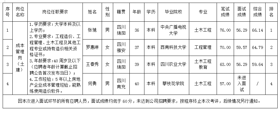 根據(jù)綿陽市綿投置地有限公司發(fā)布的招聘公告及招聘相關(guān)規(guī)定,經(jīng)筆試、面試等程序,現(xiàn)將筆試、面試成績(jī)予以公示。