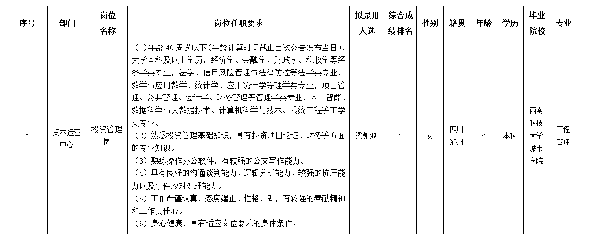 根據(jù)綿陽市投資控股(集團)有限公司發(fā)布的招聘公告及招聘相關(guān)規(guī)定,經(jīng)筆試、面試、背調(diào)等程序,擬錄用梁凱鴻同志到綿陽市投資控股(集團)有限公司工作,現(xiàn)予以公示,具體情況如下: