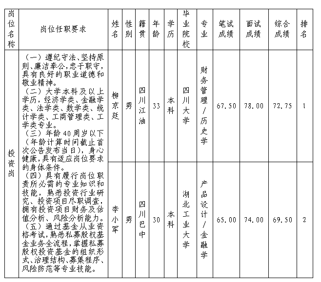 根據(jù)綿陽綿投私募基金管理有限公司發(fā)布的招聘公告及招聘相關(guān)規(guī)定,經(jīng)筆試、面試等程序,現(xiàn)將內(nèi)部選聘成績予以公示。