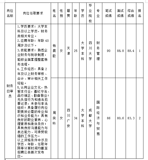 根據(jù)綿陽(yáng)富樂(lè)山九洲國(guó)際酒店有限公司關(guān)于財(cái)務(wù)日審員招聘公告及招聘相關(guān)規(guī)定,經(jīng)筆試、面試等程序,現(xiàn)將招聘成績(jī)予以公示。