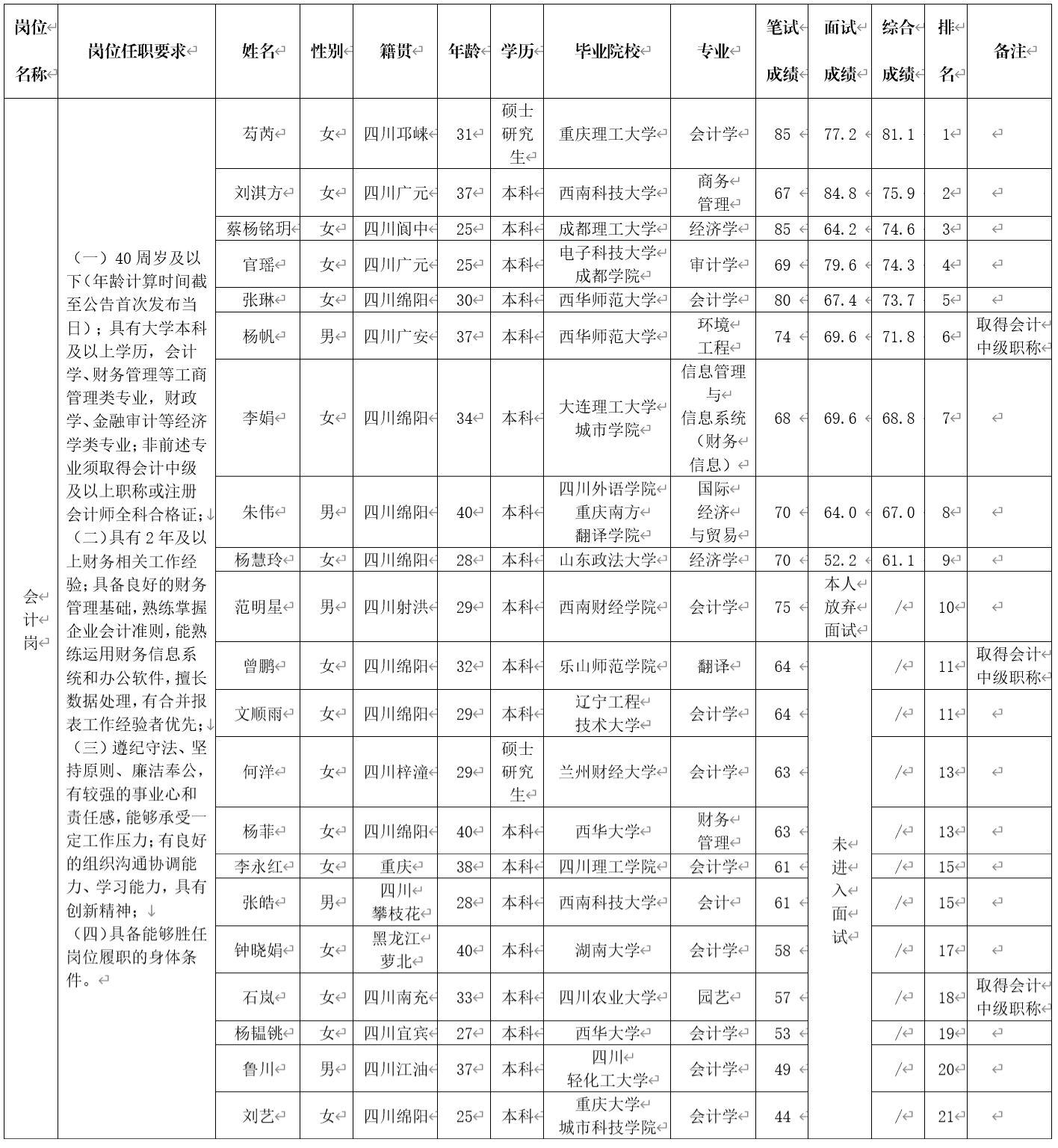 根據(jù)綿陽(yáng)金控投資管理有限責(zé)任公司發(fā)布的招聘公告及招聘相關(guān)規(guī)定,經(jīng)筆試、面試等程序,現(xiàn)將筆試(面試)成績(jī)予以公示。