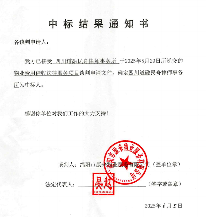 物業(yè)費用催收法律服務項目中標結果通知書