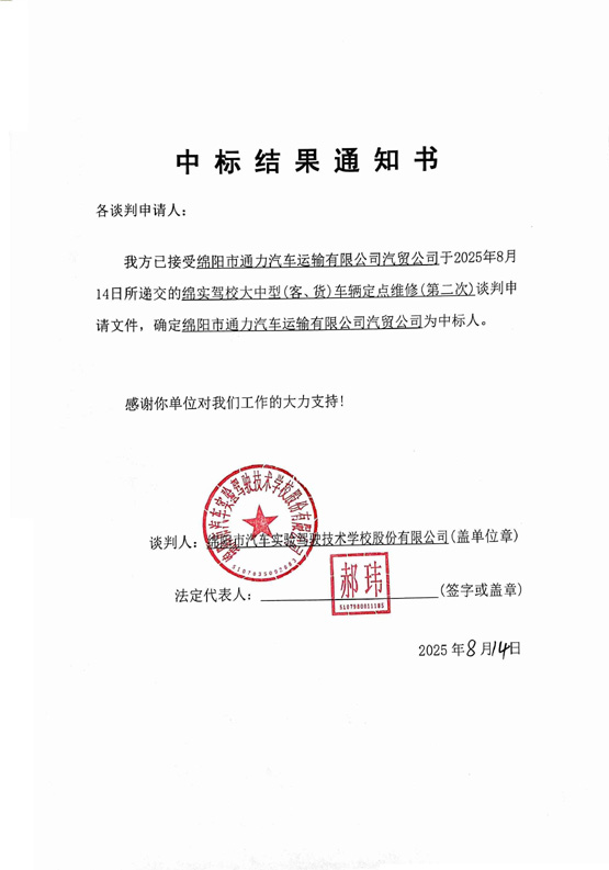 綿實駕校大中型(客、貨)車輛定點維修(第二次)中標(biāo)結(jié)果通知