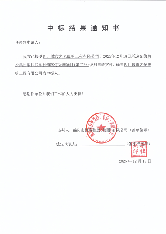 綿投集團(tuán)幫扶聯(lián)系村鎮(zhèn)路燈采購項(xiàng)目(第二批)中標(biāo)結(jié)果通知
