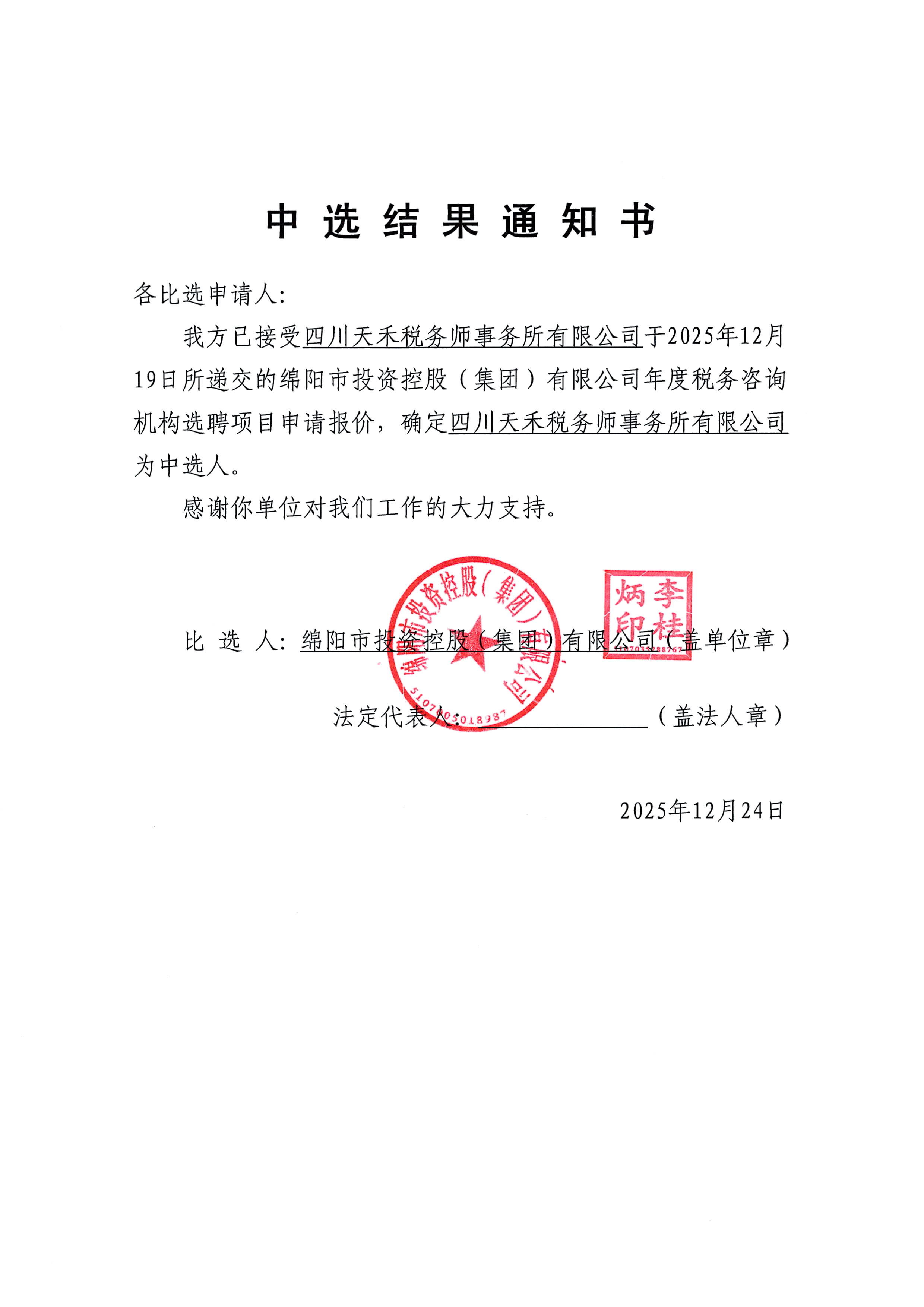 綿陽市投資控股(集團(tuán))有限公司年度稅務(wù)咨詢機(jī)構(gòu)選聘項(xiàng)目中選結(jié)果通知