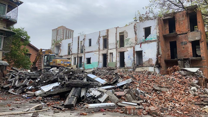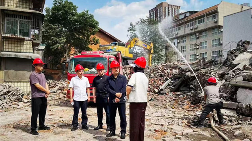 危房緊鄰周邊住宅,施工空間狹小,拆除難度極大。為確保拆除工作安全有序進行,富達公司多次組織建筑、安全專家現(xiàn)場勘查,研究制定了“機械拆除為主,人工配合為輔”的精細化拆除方案。拆除現(xiàn)場,工作人員設置警戒線封鎖拆除區(qū)域,專人疏導圍觀群眾,維護現(xiàn)場秩序。伴隨著挖掘機的轟鳴聲,危房樓體結(jié)構(gòu)在專業(yè)人員的精準操控下逐步瓦解,同步實施灑水降塵措施,整個拆除過程安全、有序、環(huán)保。